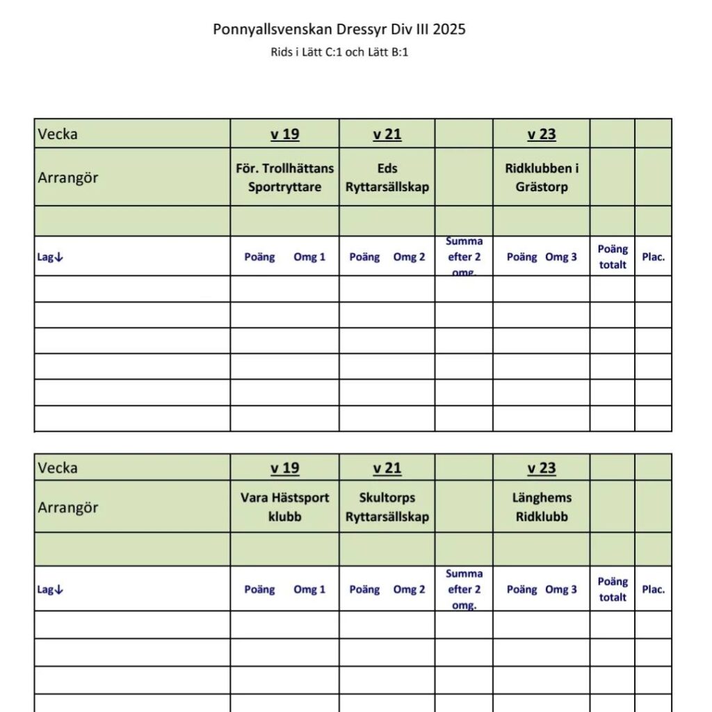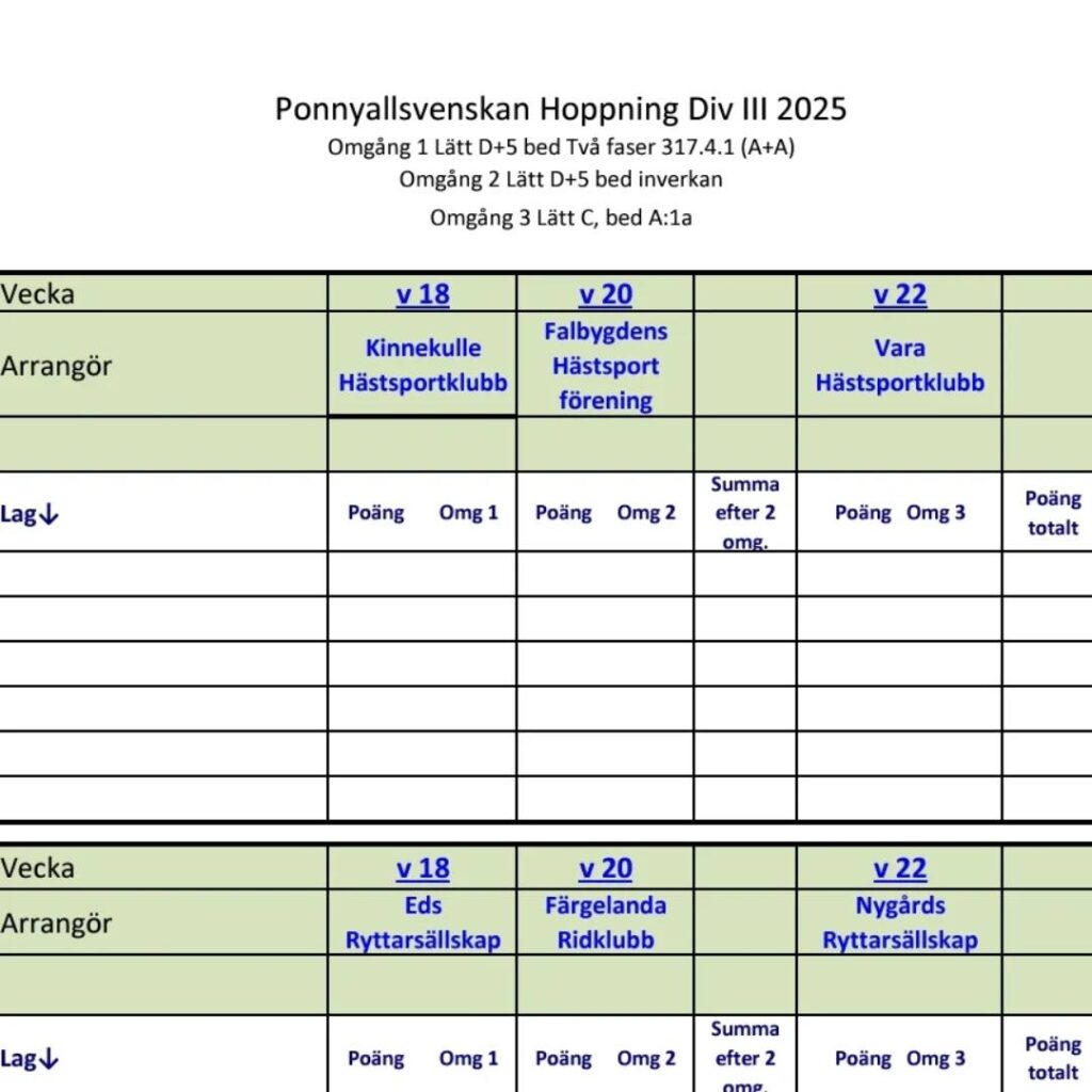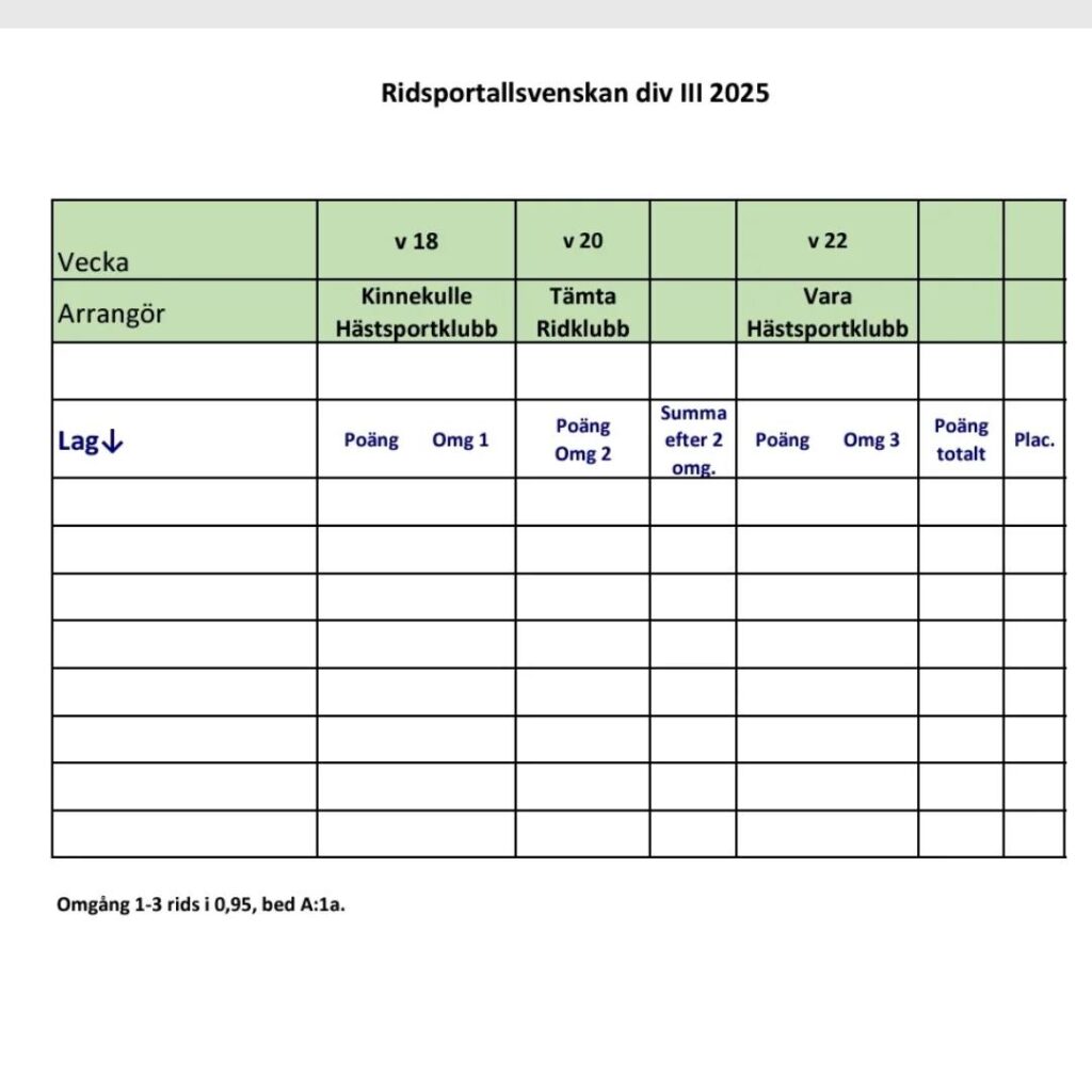 Under våren rids div 3 i hoppning och div 1 och 3 i dressyr, för både ponny och häst. Visst vill vi ha flera lag till start. Ponnyryttare anmäler intresse till Charlotte Weicker 0705-980440 och hästryttare till Anna Jonsson, Messenger eller 070-3012201. Hör av dig så snart som möjligt, allra senast 15/12