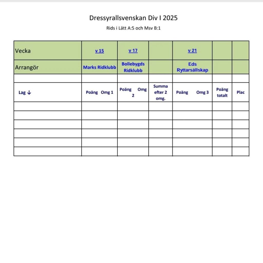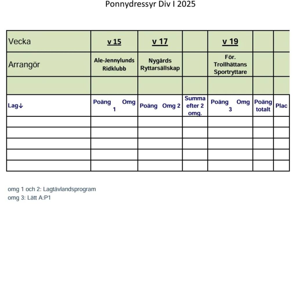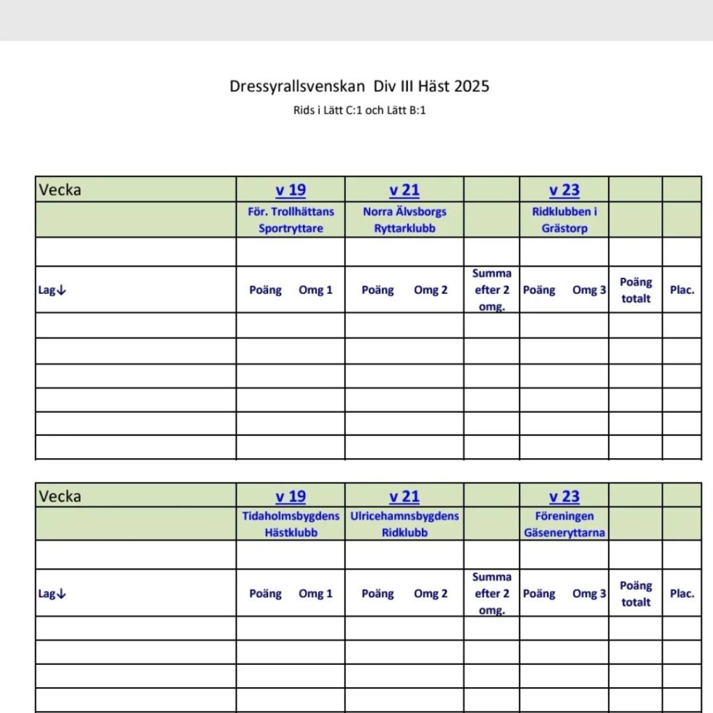 Under våren rids div 3 i hoppning och div 1 och 3 i dressyr, för både ponny och häst. Visst vill vi ha flera lag till start. Ponnyryttare anmäler intresse till Charlotte Weicker 0705-980440 och hästryttare till Anna Jonsson, Messenger eller 070-3012201. Hör av dig så snart som möjligt, allra senast 15/12